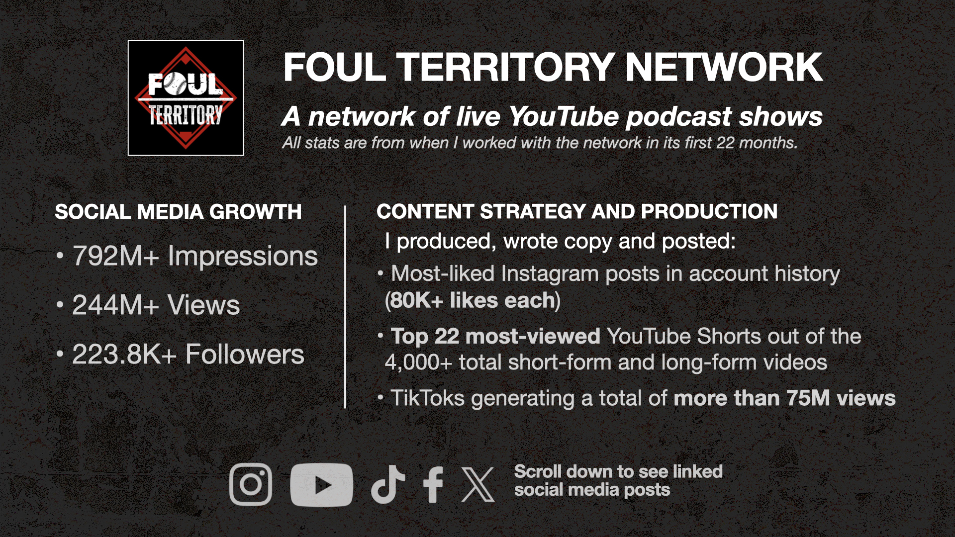 Video Editing and Graphics February 11, 2025July 11, 2025Posted in Digital Strategy, social media, SportsTagged digital-marketing, marketing, social media, tiktok, youtube Results π Instagram Examples: 2 Top-performing posts – Carousel Swipe and Reel View this post on Instagram A post shared by Foul Territory (@foulterritoryshow) View this post on Instagram A post shared by Foul Territory (@foulterritoryshow) Oprah Podcast Reel Sample: View this post on Instagram A post shared by Oprah (@oprah) YouTube Shorts Samples: TikTok Samples: @foulterritory Amazing Walker Buehler x Orel Hershiser story β from 1988 to 2024 π #mlb #baseball #dodgers #worldseries β¬ original sound – Foul Territory – Foul Territory @foulterritory Jonathan Papelbon on the strange team meeting he held after fighting Bryce Harper π¬ #mlb #baseball #washingtonnationals β¬ original sound – Foul Territory – Foul Territory Related